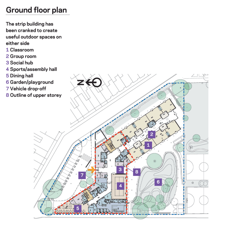 The form of the mainly two-storey school is not in itself compelling: your basic strip of rooms either side of a corridor, with a couple of kinks along its length. After considering 21 options, the kinked layout was selected because of the useful external spaces it created (see site plan below). On the entrance side, there’s a drop-off point for school buses and teacher car parking. On the other, there’s a private play area, landscaped into an attractive mini-park.