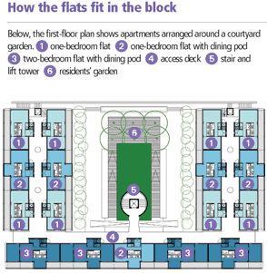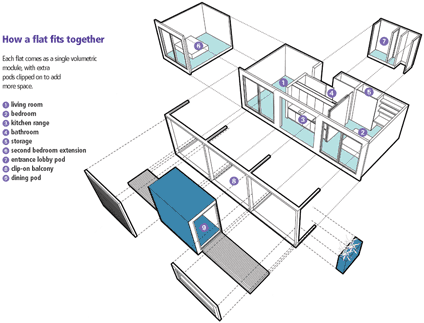 - Apartments extended with clip-on balconies, dining pods and entrance pods