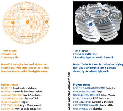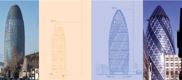 Jean Nouvel’s Torre Agbar in Barcelona may be smaller than Foster and Partners’ Swiss Re, but it’s more vibrant, colourful – and basic. Martin Spring compares the two