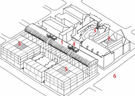 In this arrangement, the new gallery stands as the gateway to the planned cultural quarter, facing the main road that runs beyond the existing gallery and Victorian garden. A spacious glazed entrance hall is located at the centre of the elongated building and passes right through it to serve the future library and adult education centre.