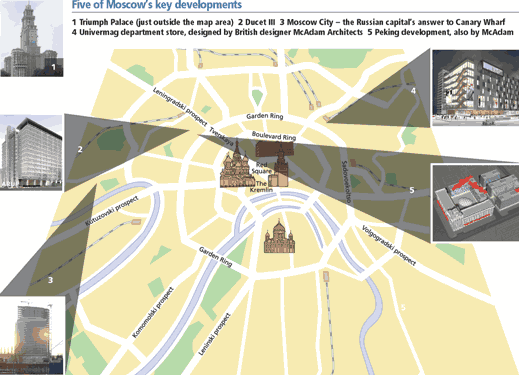 There is an acute shortage of office space, as well as of overseas consultants who can provide the quality demanded by the international corporations moving to Moscow. The boldest new office scheme in the city is by Dutch architect Eric van Egeraat, who is designing 70-storey towers for Moscow City, a Canary Wharf-style development backed by the Capital Group to the west of the city.