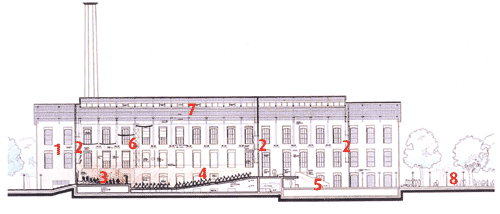 A smaller neighbouring factory building has been similarly converted into a rehearsal hall, rehearsal chambers and toilets, and the space in between filled in as circulation and services core.