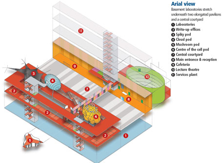 A medical research centre where scientists are banished to the basement and life-or-death matters are discussed beneath giant deep-sea creatures, orange bubble clusters and alien spacecraft … we visits Will Alsop’s most flamboyant, and contradictory, offering yet.