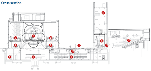 This might give the impression that the 400 research scientists based at the centre are Cinderellas in their own building, banished to creeping around in dark, dank basements, while upper levels resound to fun and games. But the boffins have little to fear: there’s nothing gloomy or claustrophobic about the basement laboratories. They occupy a football pitch-sized continuous floor, which stretches across the whole site beneath the two main blocks and the central courtyard. The pavement of the central courtyard is studded with glass pavement lights to suffuse the laboratories in daylight. The individual laboratory spaces are separated by clear-glazed partitions, which give the scientists a relieving sense of space and visual contact with their colleagues. And where the laboratories extend below the wider rectangular block, they are entirely open to the light-filled void and its four pods floating directly above them.