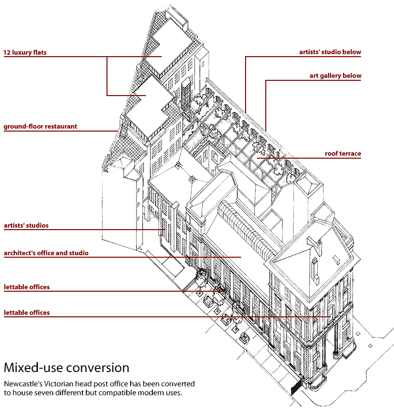 The scariness started when Smith decided to put his money where his mouth is – by acting as planner, architect, joint developer and part occupier of one of the most ambitious projects of his career: the conversion of a huge Victorian post office in the centre of Newcastle. Like many architects in the era of Lord Roger's urban taskforce, Smith preaches mixed-use urban regeneration. Genuine mixed use, he is keen to point out, means combining several complementary uses in a single building. "Mixed use in one building has that degree of vibrancy that you need in cosmopolitan architecture," he says.