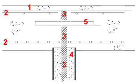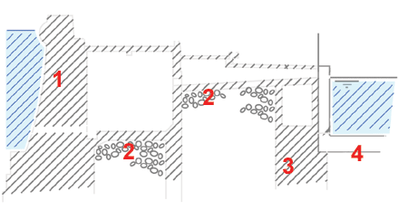 On the sun terrace above the plant room to the west of the pool there is a fall of 100 mm so any seawater that comes over the top of the sea wall is drained away. Because screed is liable to crack if it is more than 50 mm thick, the slope is built into the reinforced concrete base, which is 325 mm at the edge of the terrace and 425 mm at the top of the slope.