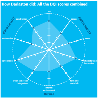 The lesson from testing the DQI at Darlaston Swimming Pool might be that the resulting spider charts tell a limited and sometimes distorted story. On the other hand, low scores to specific questions graphically pinpoint problem areas that require deeper probing, discussion and resolution. It seems the act of gathering together a varied group of stakeholders to discuss and assess the building is in itself the most useful part of the whole exercise.