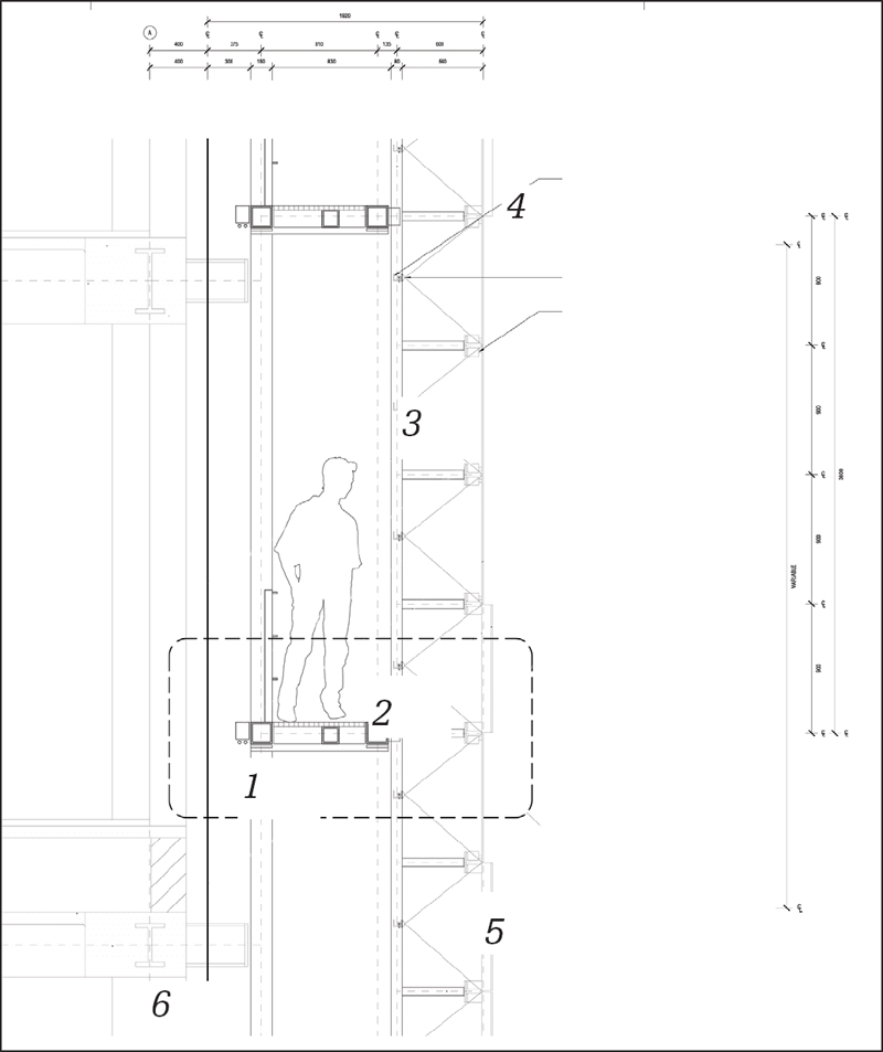 The wall is made up of several layers. On the front surface are 900mm x 900mm glass panels mounted on a steel frame, which in turn is hung off the existing facade. Behind each of these is fixed an LED light source that can project red, green and blue light onto the glass. There are a total of 2,292 of these, each of which can be controlled independently – like a pixel on a computer screen – and which, when linked together, allow images to be displayed across the wall.