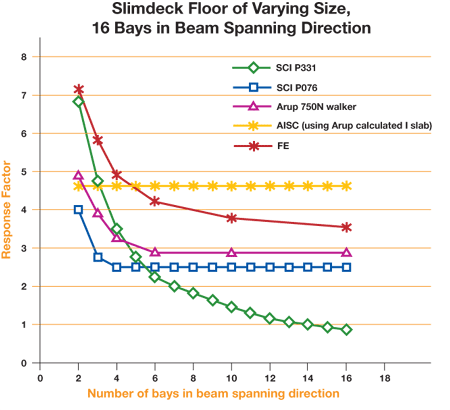 “The basis of the SCI’s Guide P331 has not been published, peer reviewed or even made available for peer review. The guide shows the predicted dynamic response under footfall to decrease towards zero as more floor bays are added.