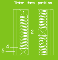 The Napier report found that the best performing party wall was the timber-frame wall with a typical twin frame of 90 × 45 mm studs with 75 mm cavity and 90 mm quilt insulation and plank and plasterboard on both sides (see diagram of timber wall, page 08). The worst performing wall in the study was the 215 mm block wall with plasterboard on dabs, which had a fail rate of 49%.