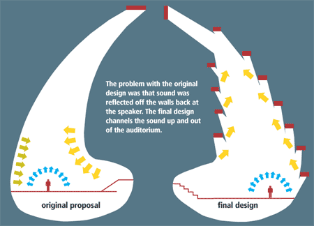 To direct the sound out of the flask, the designers altered the angles of the enclosure's lower walls to reflect the sound upwards and out of the space. This reduced the problem significantly, but it did not remove it. Further modifications were tested, and more and more of the wall sections were tilted upwards, so that in the end a vertical slice through the chamber showed a saw-tooth cross-section (above).