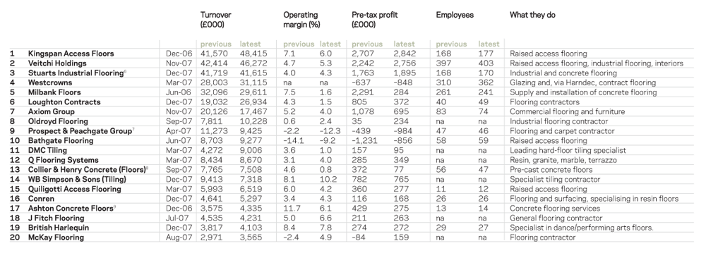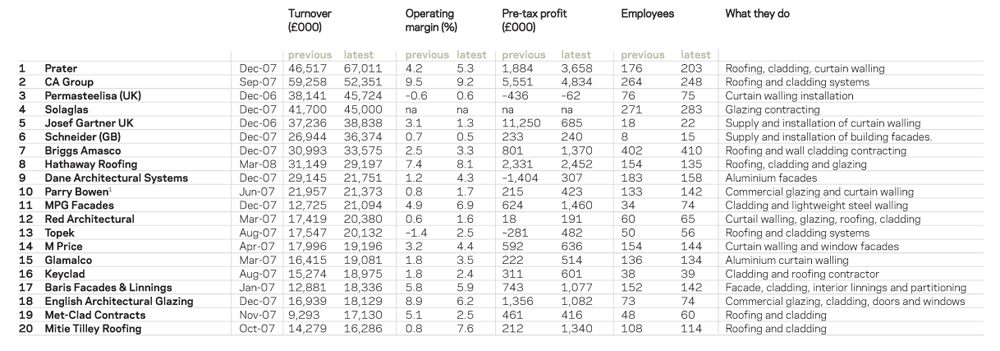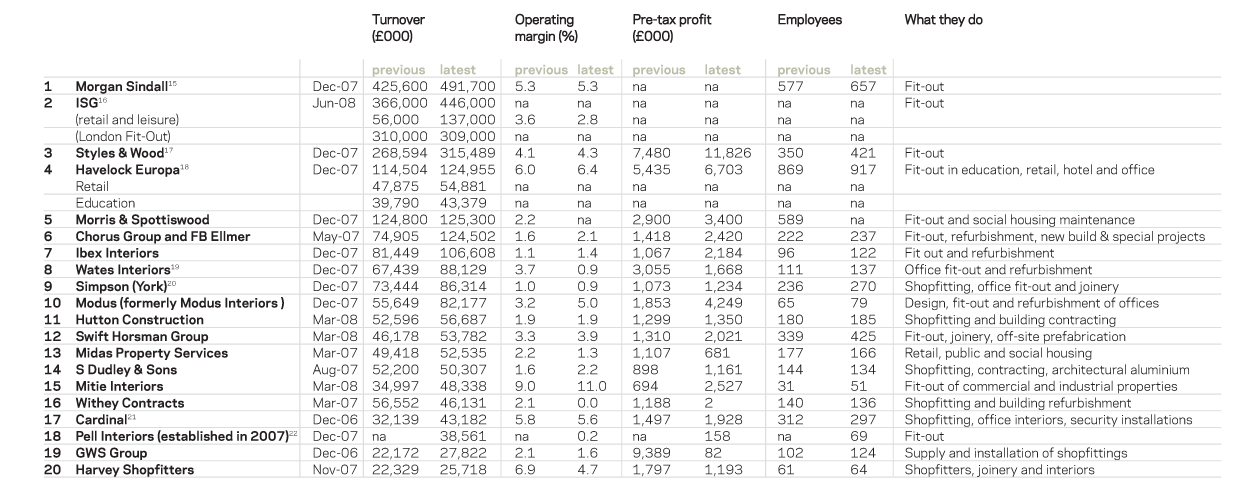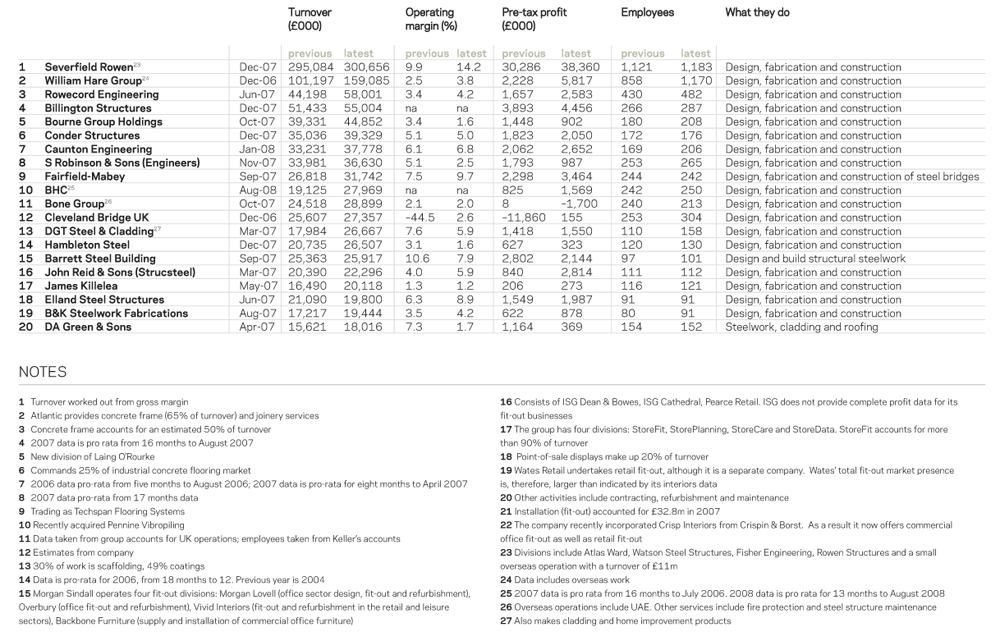 The aim was to identify the main companies involved in the provision of specialist contracting services. Thus, the tables have tried to quantify contracting and not manufacture or hire activities. However, this has not always been possible and in several instances we have had to report a firm’s total turnover, including its non-specialist contracting and other work. As a result, the listings are not an exact measure of a company’s contracting turnover, or even their ranking, but more an indication of their importance in the marketplace. This is particularly the case in the scaffolding, building envelope, flooring, fit-out and steel categories, where many firms make and/or supply as well as installing. Therefore, in some areas, one company may have a larger contracting activity than another, but appear lower in the rankings owing to the fact that other firms have a larger combined turnover.