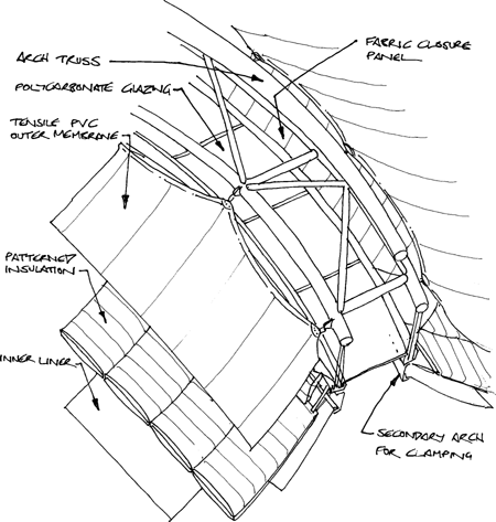 The specification of the structure would have been relatively straightforward if it hadn't been for the thermal performance requirement: the structure had to comply with Part L of the Building Regulations. But Muir had taken a calculated risk in designing this roof; he knew that tensile membrane maker Architen Landrell had been researching insulated fabric roofs for a number of years. And he had quoted for a job that required the retrospective insulation of a tensile roof. The quote was too expensive for the client, but Muir was confident that membrane roofs could be insulated. "I knew it could be done because of our experience, but we needed the expertise of Architen Landrell to actually design the structure," says Muir.