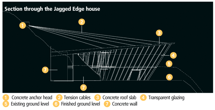 Weber says: "The design concept at the heart of Jagged Edge is deceptively simple. It's a tension structure supporting a large concrete roof with the tension cables anchored back into the natural rock."