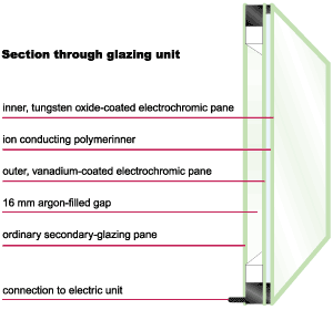 The electrochromic film is sandwiched between two 4 mm layers of Pilkington’s K-glass, a low-emissivity glass designed to reduce heat loss through windows. One sheet has a tungsten oxide coating applied to it, the other a coating of vanadium-based oxide. Holding the sheets together is a polymer that is conductive to ions. An electrical voltage applied across the film causes ions to be transferred out of the vanadium layer, through the polymer, to settle on the tungsten oxide film, which causes the oxide to turn blue.
