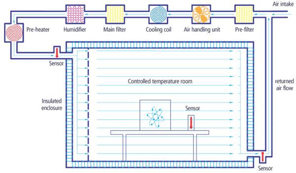So what do you do when you cannot use an off-the-peg solution (as was the case at the NPL)? The answer is that the rooms must be designed as bespoke systems. Ideally, they should be in the centre of a building, with no external windows, and a high level of insulation, sealed, and fitted with conditioned airlocks. A "buffer zone" of rooms, with progressively reducing temperature tolerances around the critical area helps to maintain the temperature.