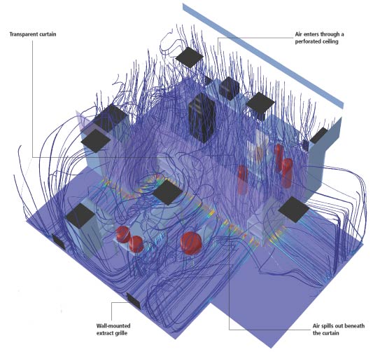 At the NPL, only the areas where experiments are carried out have close control. These are not isolated from the rest of the laboratory, so large volumes of air are directed from a wall plenum horizontally across the experimental benches to cope with heat gain. Tucker and Andy Parker, who looks after the business side of Amec's pharmaceutical and chemical industries, agree that this approach sounds appropriate.
