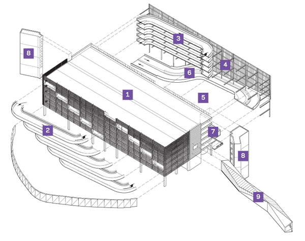 On the west side is a regional police headquarters which, worried about criminal espionage, demanded a privacy screen beyond the ramps. Even so, the west side reveals a special double-sized ramp, which combines up and down carriageways and rises to the double-storey height of the first floor to clear the double-decker buses below. Twice as wide and twice as high as the other ramps, this bulges out further in a vivid vermillion that contrasts with the neutral, translucent polycarbonate panels of the privacy screen above.