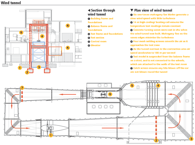 The daunting task of turning the 114 m long wind tunnel into a testing facility for Formula 1 cars fell to multidisciplinary firm Ridge. The reinforced concrete structure had to be overhauled and a new structural frame for a £6m rolling road – the F1 version of a gym treadmill – had to be shoehorned into the building (see diagram). In total, the project will have taken Ridge nearly two years. This is the story of how post-war engineering has been harnessed to develop some of the fastest cars in the world.