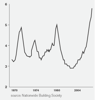 The “no recession” case has always rested on the twin arguments of the affordability of the product in times of low nominal rates of interest, and on the structural shortage of housing. To start with the first of these two arguments, the affordability issue remains hard to evaluate, for the historical benchmarks drawn from a high-inflation era do not necessarily translate into appropriate guidelines for the contemporary low-inflation, low-interest era. As shown in the graph below the Nationwide house price–earnings ratio peaked at 5.00 in the second quarter of 1989, almost identical to the 4.89 peak in the first quarter of 1974. Both housing booms were broken by exceptionally high interest rates (13% and 15% respectively). In this boom, the house price–earnings ratio has gone well beyond anything seen in the past, and the Nationwide ratio is now 5.8. For all that economists correctly point to the real cost of borrowing in a period of low inflation, a rise in nominal interest rates from 3.5% to 4.75% has not (yet) had the same effect on house prices.