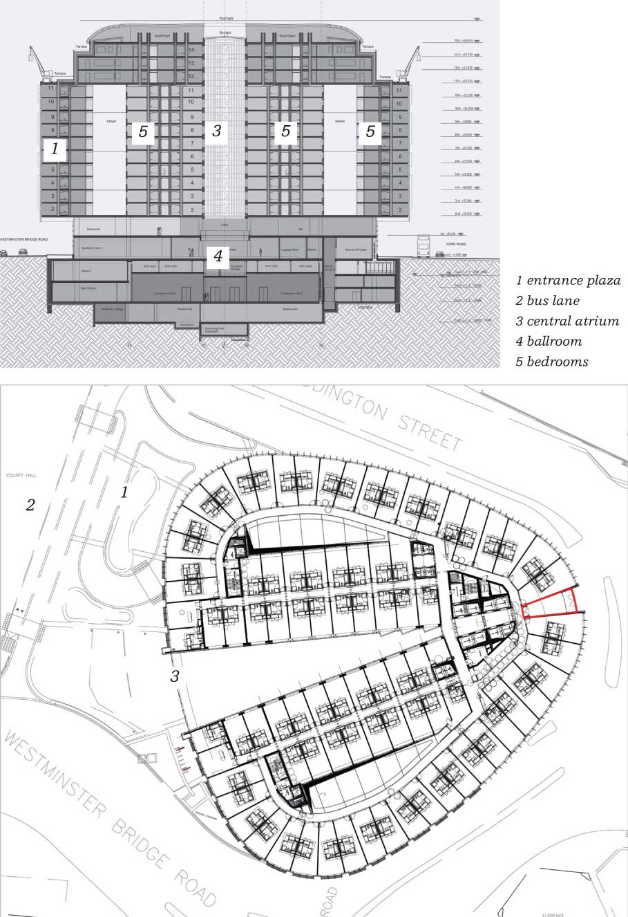 The view over the river has dictated the internal layout. In plan, the building is similar in shape to a guitar plectrum (see plan, page 48), with one long side that overlooks the river. The building has a V-shaped atrium with the wide end at the bridge side of the building. The idea is that as many bedrooms as possible will have that Westminster sunset view. Bedrooms open off a central spine corridor running along each floor – the ones on the inner side of the corridor get the light and views from the atrium and the ones on the outside face the street. Inevitably, some of the rooms overlook the more anonymous side of the site but are at least spared the railway line, as the lift cores occupy the part of the building closest to the tracks.