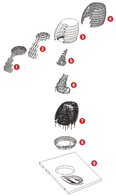 Foster has responded to this mould-breaking client, procurement process and site with a mould-breaking architectural design. For starters, there is no trace of that traditional badge of a government assembly chamber – hardwood panelling and fittings. Modern glass, steel, aluminium, and yellow-painted plasterboard are the dominant materials. The overall forms are voluptuously curvilinear – a lopsidedly mutant hemisphere on the outside and the baroque spiral ramp on the inside. Closer in, the elements comprise dizzily slanting window frames, raking columns and suspension rods, and a criss-cross tubular-steel frame that rises up between the ramp and the riverfront curtain wall.