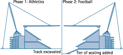 The stadium's metamorphosis from an athletics to a football venue will involve the contractor removing the running track (which is recyclable) and the central swath of grass. Laing will then excavate the stadium's bowl a further 6 m to create the football pitch and add a third tier of seating. The 10,000-seat north stand, built for the athletics, will be removed to allow a permanent stand to be constructed to complete the oval of seating for the football stadium (see "How the athletics stadium will be transformed into a football ground"). However,for the time being, the construction team's efforts are focused on getting the stadium ready for the games' March 2002 handover. "It is a demanding construction programme for a unique building," says Lumberg.