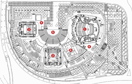 The third urban design benefit is the creation of a free fourth performance venue within the complex, which serves as a public piazza when not in use. This is a semi-circular open-air amphitheatre seating 3000, which has been carved out of the podium linking the three halls.