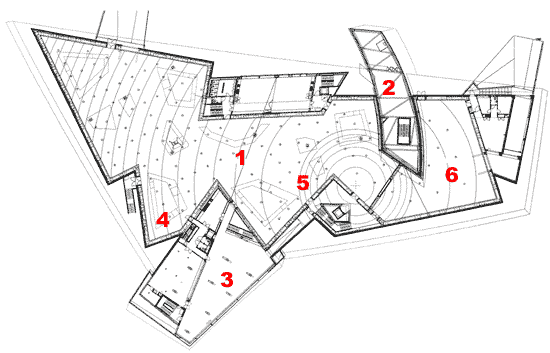 Libeskind's rationale of world conflict, translated into built form, begins with a globe representing the world, which is broken into shards – the dish shapes – or "traces of history". Three of these shards are then brought together again to form the "fractured landscape" that is the building.