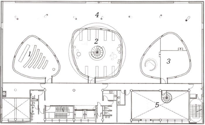 The main library hall on the fourth floor is an expansive, double-height space punctuated by three of Alsop’s trademark pods: large gourd-shaped enclosures floating in the upper void. This weird arrangement combines 60 secluded study spaces below the three pods with light and airy areas for shelving and circulation.