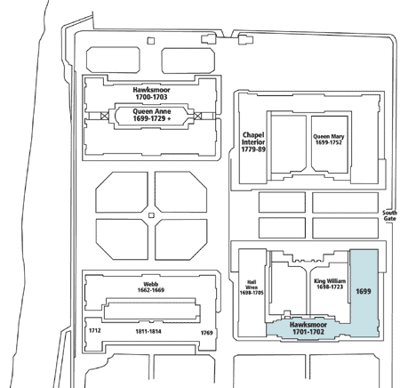 Much of the west range conforms to Hawksmoor's original plan. A central corridor runs the length of the building. Off this are original cellular rooms, or "cabins" as they are known in deference to the building's naval history; these would have housed the veteran sailors. Original panelled oak screens with glazed areas above (added at a later date) separate the rooms from the corridor. The majority of this was intact, albeit hidden under hardboard and layers of paint. The cabins proved ideal for conversion into offices for lecturers and administrative staff.