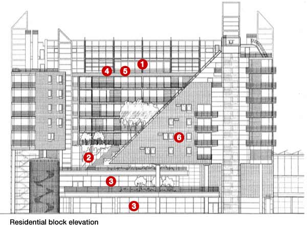 Low-energy strategies had a major impact on four primary aspects of the building design, from overall massing to the detailed design of facades and internal fitting-out. The differing requirements for office and residential blocks led to different design solutions within similar overall concepts.