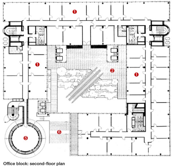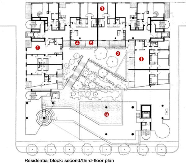 Given the flamboyance of the building exteriors, the interiors are relatively uneventful, although all share the spectacles of the half-enclosed landscaped courtyards. As required by the client, the offices are conventionally divided into cellular rooms with central corridors. All the flats have double aspects, with views out to the street on one side and attractive balconies and conservatories overlooking the courtyard on the other.