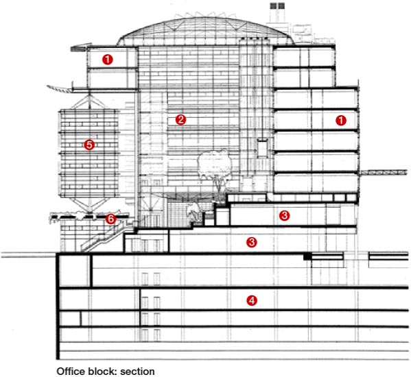 The eight facades of the two office buildings facing into the atria and out to the surrounding streets were divided into bays 2.7 m wide and one-third of a storey in height, each of which was "fine-tuned" in response to the amount of sunlight, daylight and hot or cold air they received. The result in the office blocks was a kit of about 15 parts that were varied to suit the precise microclimate next to each facade subsection.