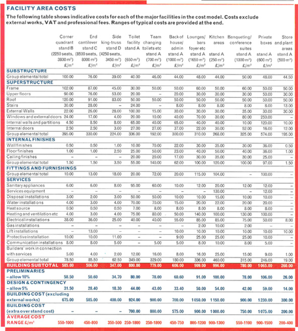 Cost comparisons for stadiums and grandstands are traditionally presented in the form of cost per seat. With the rising importance of hospitality areas, the cost/m2 of these facilities must now also be accounted for.