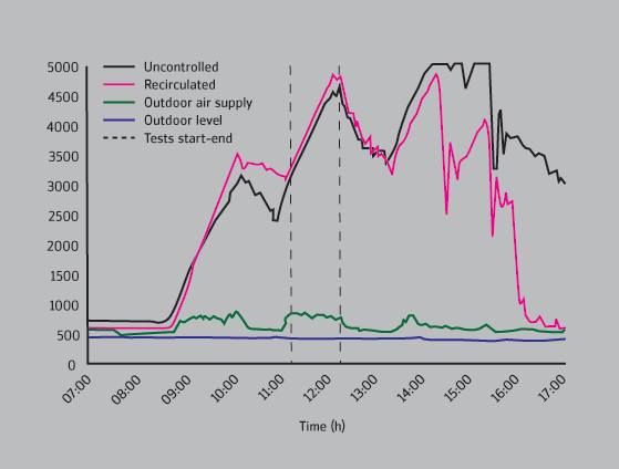 Figure 1 shows a typical CO2 pattern in one of the classrooms during a day when performance tests were completed. The 156m3 room was occupied by 23 children and one teacher. The schedule, including lessons and break times, can be clearly seen from changes in the CO2 concentrations. The uncontrolled condition on figure 1 shows the CO2 level before any intervention. The CO2 concentrations obtained during the week of recirculation ventilation match closely the uncontrolled levels. When the ventilation system was switched on to provide outdoor air, the CO2 concentrations fell dramatically and remained at less than 1000 parts per million throughout the day.