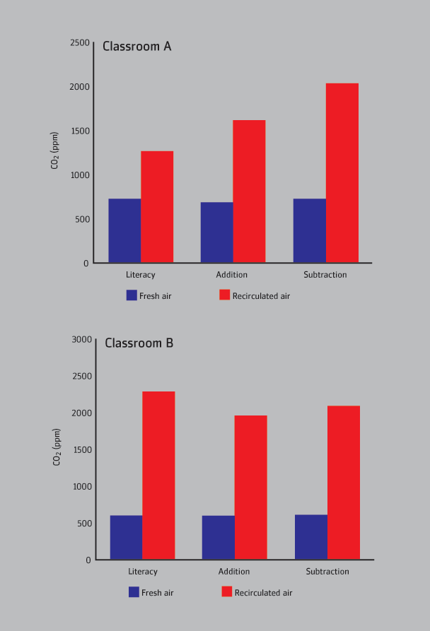 The tests were all given to pupils on the same days and at the same time, before the lunch break when CO2 concentrations had reached the morning maximum.