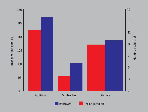 A significant impact of the ventilation rate on the work performance of pupils was observed in both classrooms. Summarising the effects, the overall performance of all children increased under improved ventilation by 5.1% and 5.8% for addition and subtraction while pupils with higher skills increased by ~7% .