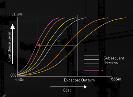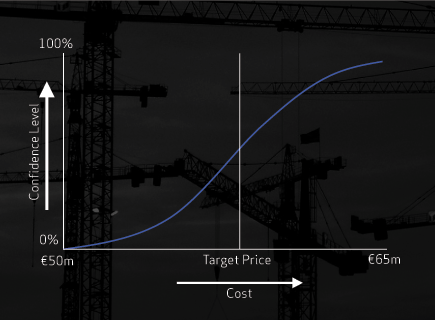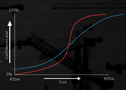 On the example graph, we can draw a line vertically from the cost axis at the point of the base cost, excluding contingency. It crosses our ‘S’ curve at the 20% point. This means that in the analysis, 20% of the possible scenarios came to the base cost or less. In other words, 80% of the possible scenarios exceeded the base cost. Or, put another way, there is an 80% chance that the base cost will be exceeded. Now that’s useful information, so what are you going to do about it?