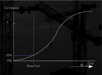 Let’s go back to the graph. Draw a line from the 50% point on the vertical axis to the curve then down to the horizontal axis. The difference between this point and the base cost is the amount of contingency that must be added to improve our confidence from 20 to 50%.