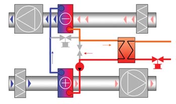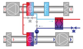 In addition to the two energy recovery coils, the Econet unit incorporates a heat exchanger. This enables the system to supply additional heating or cooling energy to the supply air, eliminating the need for more heating and cooling coils in the air-handling unit and their associated pumps, valves and pipework.