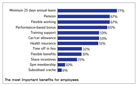 This is not yet a common approach among employers, however. In our survey, they listed the top three benefits offered to staff as pension (83%), training support (78%) and at least 25 days’ annual leave (71%). Employees listed their top three benefits as at least 25 days’ leave, a pension and flexible working options.