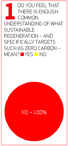Our first question to the leaders was: do you feel that there is enough common understanding of what sustainable regeneration – and specifically targets such as zero carbon – means? Every single respondent answered with an unambiguous no. Many respondents spoke of a need for clarity in the face of confused messages, jargon and sound bites.