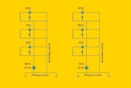 An early attempt simply tied the pump speed (expressed as a percentage between the minimum and maximum speeds) to the maximum demand of the control valve. For example, if the maximum control valve demand was 70%. the pump speed would be set to 70% of the control band between the minimum speed of 20 Hz and the maximum speed of 50 Hz, in other words 20 + 0.7 (50 - 20) = 41 Hz.