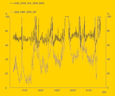 The end result (see Figure 3) shows the Gallery 29 CHW pump speed changing as the maximum control valve position changes. This may not look particularly stable, but this data is taken over several days and has thus been compressed. On an hour-to-hour basis the control is quite stable and does not cause any problems in any of the controlled spaces. Bear in mind that at any time when the pump demand is less than 100%, energy and running costs are being saved.