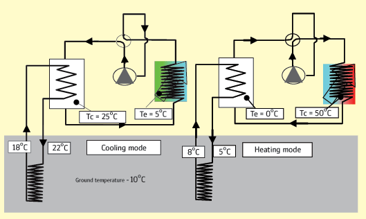 To achieve both heating and cooling a reversible heat pump is used with a four-way reversing valve to change over from heating and cooling. Ground source heat pumps are special versions of conventional water source heat pumps designed to operate over an extended range of entering water temperatures. The operation envelope for the heat pump is controlled by the heating mode. Under this mode typical evaporator temperatures range from - 5ºC to 12ºC, whereas the condenser temperature can be restricted to 50/55ºC.