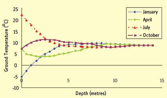 The most useful depth for cooling is the first 200 m. Figure 1 (right) shows the measured values of ground temperature as a function of depth for the important top portion of the ground. From this it can be seen that during the summer a depth of 4 m would provide a soil temperature of 10ºC. This remains constant to about ±2ºC and the average temperature is an approximate average of the annual ambient dry bulb temperature. However above this depth there is a swing due to the effects of the seasons, as shown, with the ground temperature out of phase with the ambient temperature due to the capacitance of the ground.