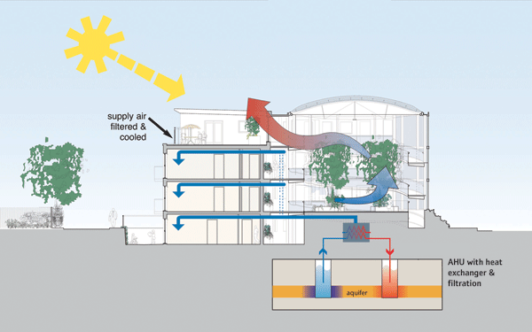 A system will usually consist of a warm well and a cold one. In the summer, groundwater from the cold well is pumped to the building. The groundwater absorbs heat from the building and is discharged into the warm well where the thermal energy is stored. In winter ground water from the warm well is pumped to the building and releases heat energy. The water temperature cools down and returns to the cold well. This inter-season storage system works efficiently and has a high performance.