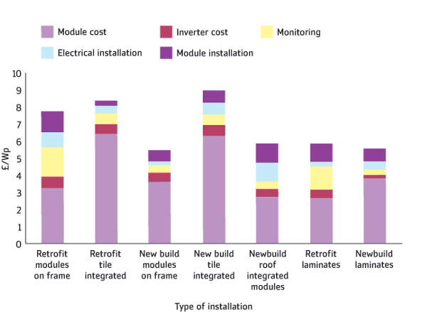At £5.11/Wp, new-build, frame-mounted systems were the cheapest overall; new-build, tile-integrated systems were the most costly at £8.28/Wp, because the tiles are expensive and the high number of wiring connections for the same size of system takes longer to install (see figure 2).