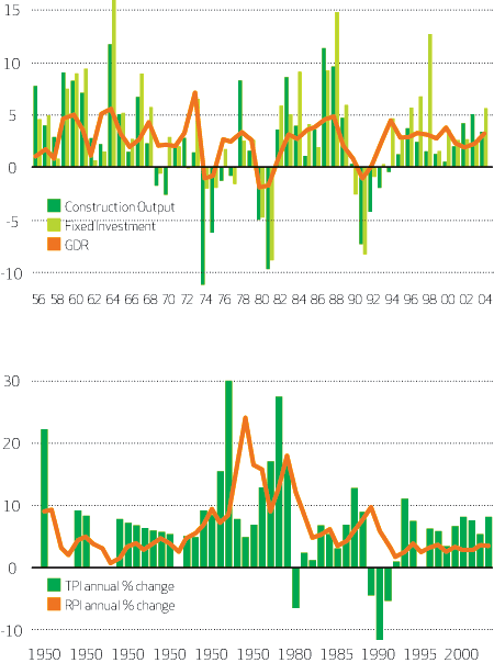 Figure 2 shows that since the 1950s there has been a fairly close relationship between annual GDP and annual construction output. The latter tends to be more volatile and for the past five years both have been relatively stable. Again, all long-term economic forecasters predict steady GDP growth of between 2% and 3%, which would suggest continued growth in construction.